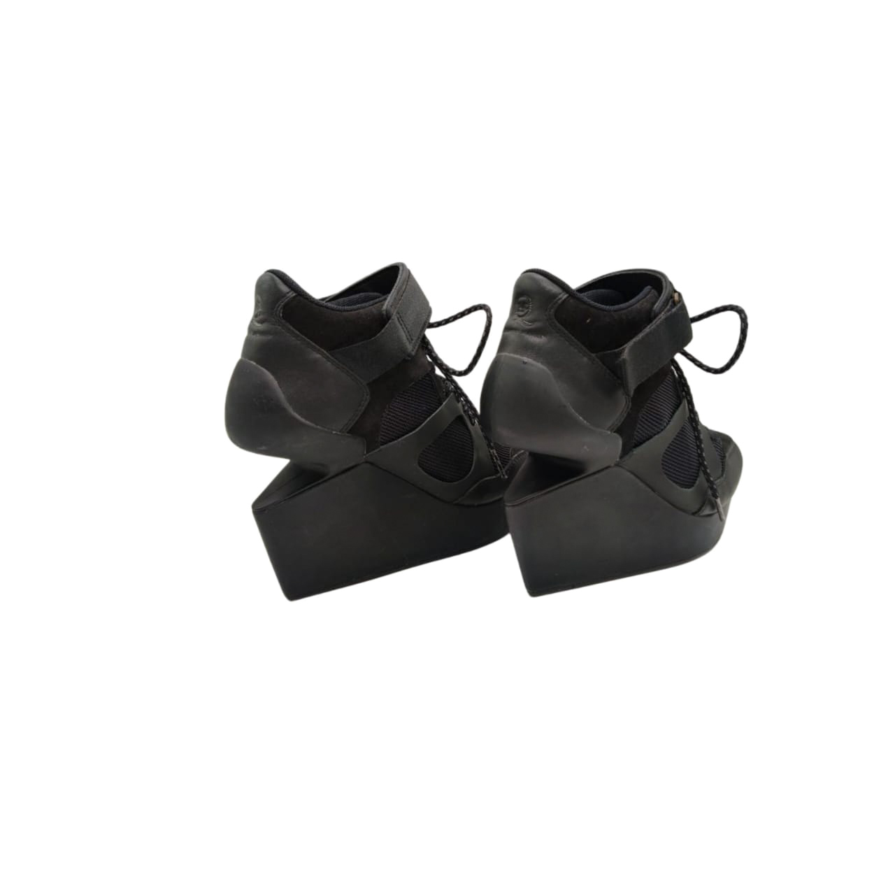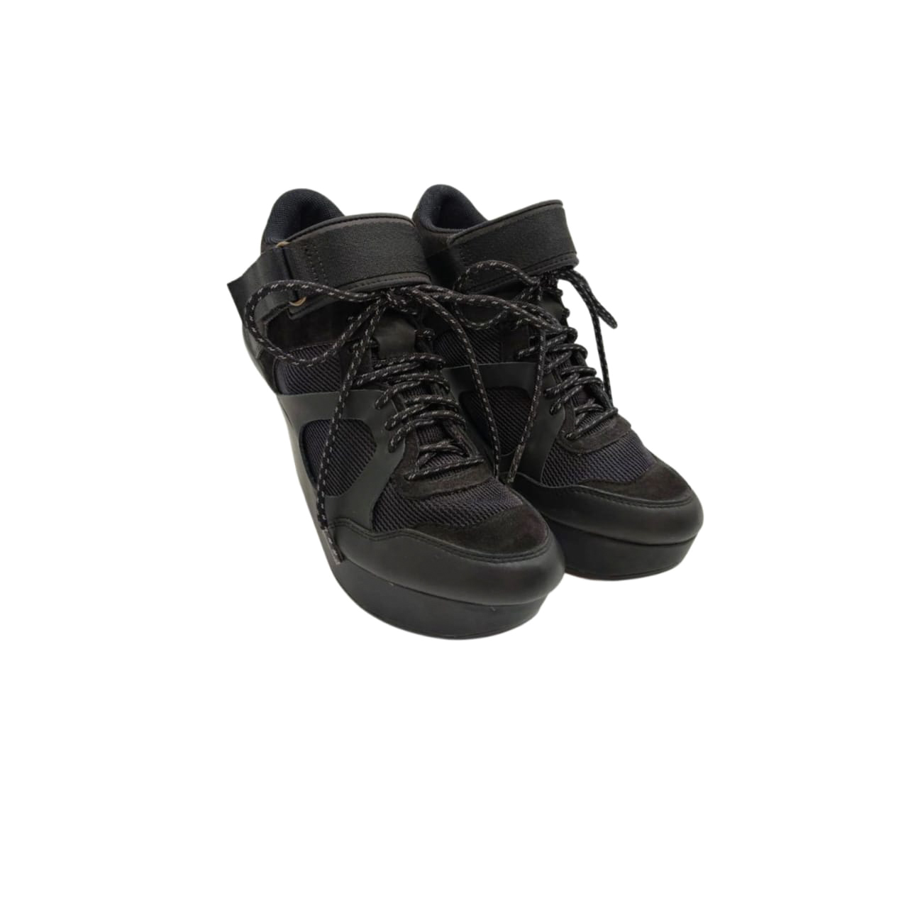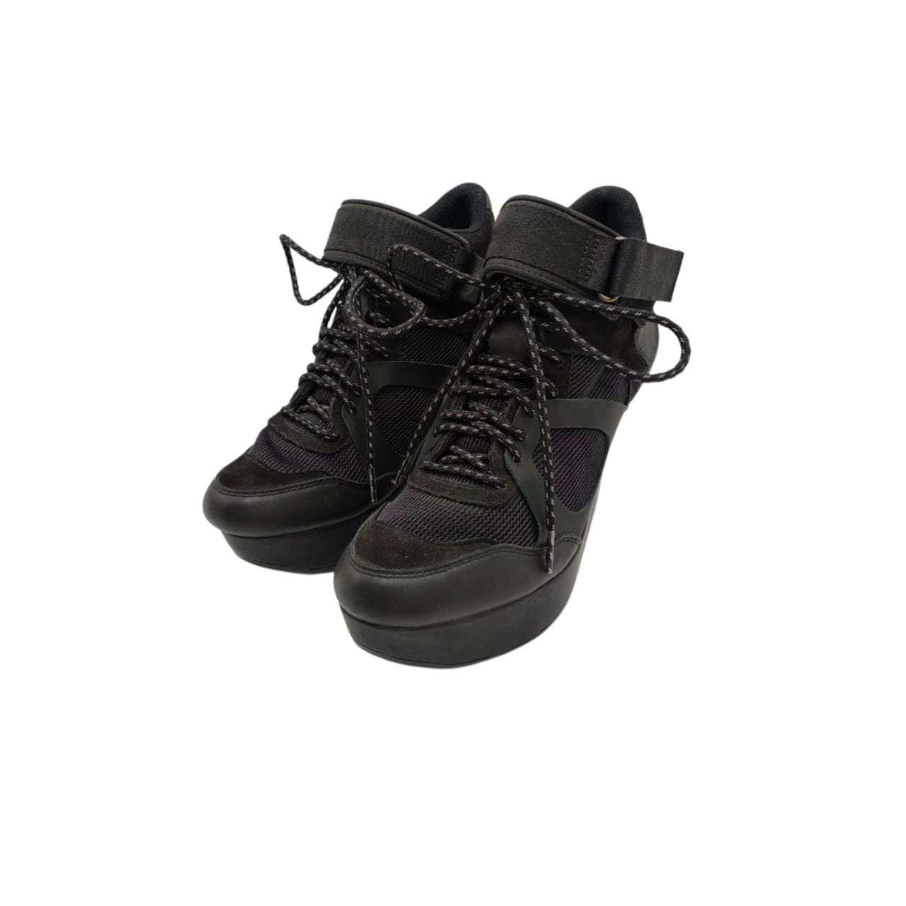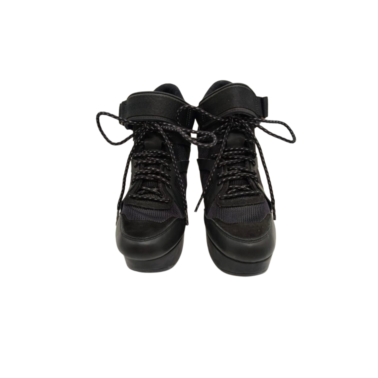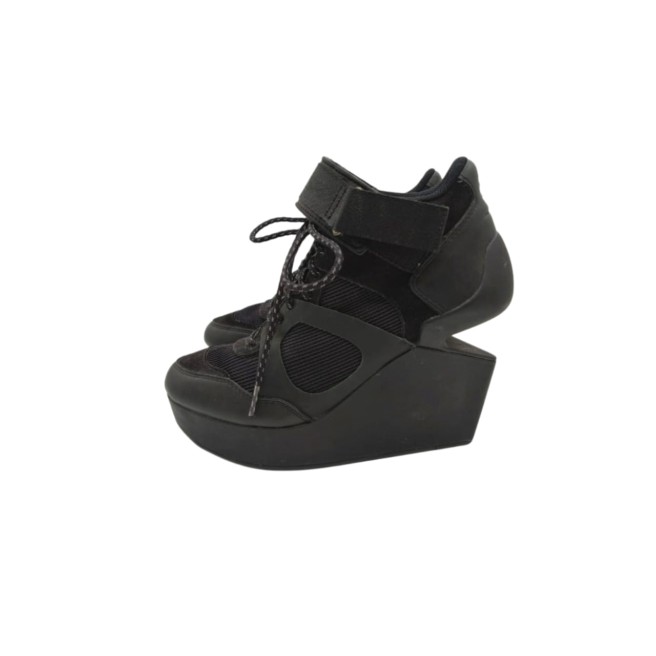 Crafted in sleek black with a mix of leather and mesh panels, the design is enhanced by a lace-up front and adjustable Velcro ankle strap for a secure, comfortable fit. The dramatic wedge platform adds height while maintaining a sporty, fashion-forward aesthetic.